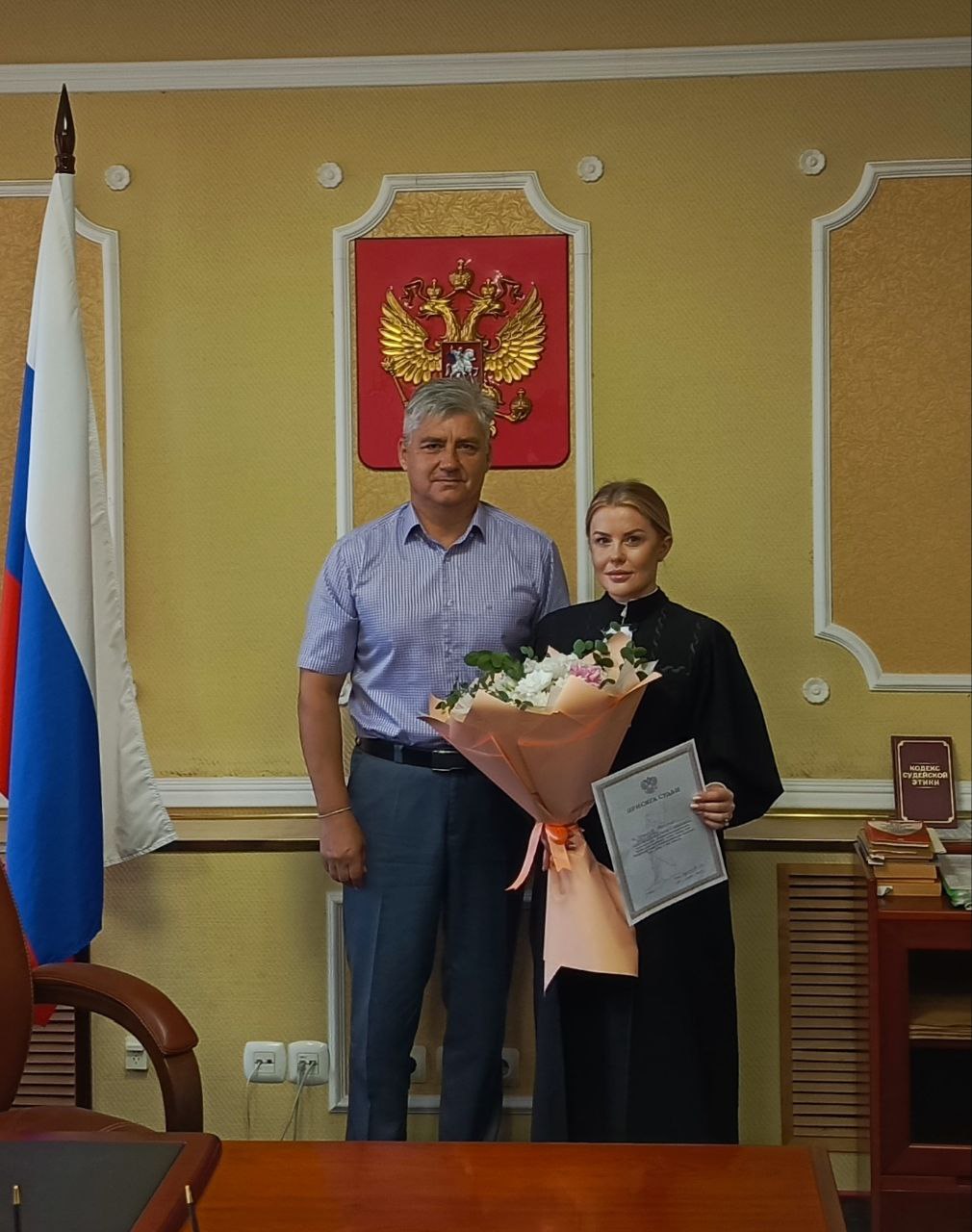 На основании приказа начальника Управления Судебного департамента в Хабаровском крае в штат Ленинского районного суда г.Комсомольска-на-Амуре зачислена и с 07.07.2025 приступила к работе вновь назначенный судья Герасимова Анастасия Владимировна (Указ Президента РФ от 12.06.2025 №397). До назначения на должность судьи, Герасимова А.В. замещала должность помощника судьи Хабаровского краевого суда. 07.07.2025 Анастасия Владимировна в торжественной обстановке приняла присягу судьи. Коллектив суда, во главе с председателем суда – Щербининым Игорем Владимировичем, дружно поздравили коллегу с назначением на должность и пожелали Анастасии Владимировне плодотворной работы и успехов в осуществлении правосудия.![]() |